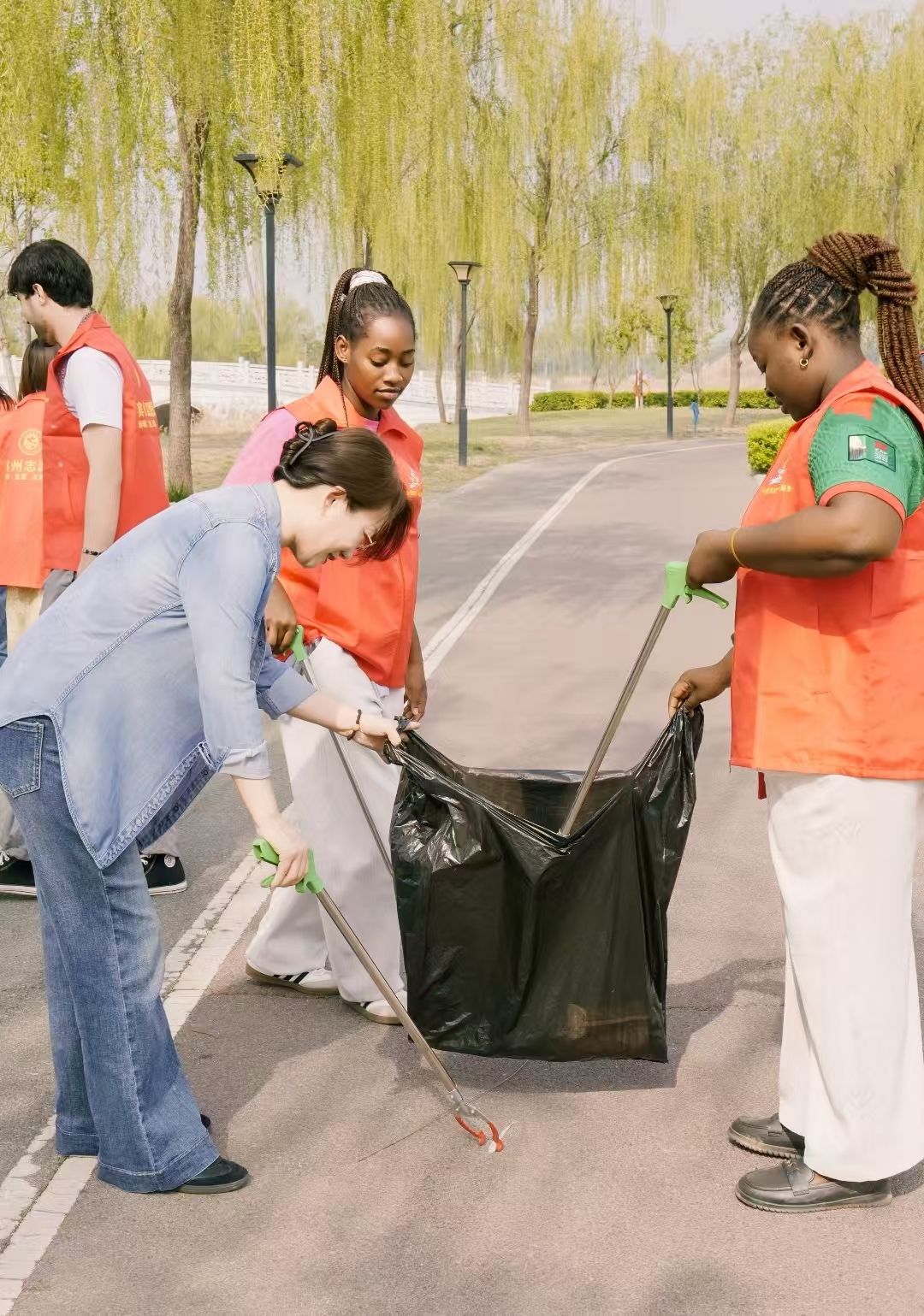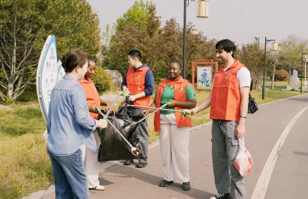 During the event, the international student volunteers actively carried out a campus park environmental sanitation clean-up, carefully clearing litter and debris from the walking paths, lawns, and public areas, demonstrating their care for the public ecological environment through concrete actions. Through this hands-on practice, they further strengthened their sense of responsibility and duty, and actively integrated into the daily life of the city, joining hands with their youthful energy to protect their beloved home.